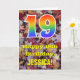 A frente deste design de cartões coloridos, inspirados na natureza e rústicos de cumprimentos de aniversário apresenta um grande número de "19", com um padrão inspirado no espectro do arco-íris. Também apresenta a mensagem "Feliz 19º aniversário", e um nome editável. A frente apresenta um pano de fundo que mostra folhas caídas rústicas no outono. O dentro apresenta uma mensagem de saudação de aniversário personalizável, ou talvez possa ser apagado e deixado o vazio se uma mensagem for escrita manualmente. Um cartão de aniversário personalizável como este pode ser uma maneira divertida de enviar uma mensagem em comemoração do décimo nono aniversário de alguém. [~Z0000384]