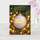A glass ornament signifying the year 2026 dangles from a pine tree branch, illuminated by the warm glow of soft golden lights.