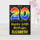 A frente deste design de cartões de saudação de aniversário divertidos, vibrantes e coloridos apresenta um grande número "20" com um padrão inspirado no gradiente do espectro arco-íris, junto com a mensagem "Feliz 20 de aniversário", e um nome de destinatário personalizado. A frente também tem um padrão de várias notas e símbolos de música com várias cores e tamanhos. O dentro apresenta uma mensagem de saudação de aniversário personalizada, ou talvez possa ser limpo e vazio à esquerda se uma mensagem for escrita à mão. Um cartão de aniversário como este pode ser uma maneira divertida de enviar desejos de aniversário a um músico, cantor, compositor ou outra pessoa que esteja celebrando seu vigésimo aniversário. [~Z0000420]