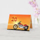 Uma moto semelhante a um Harley parado ao lado do mar com um glorioso pôr do sol laranja. Um cartão de excelente para qualquer pessoa que goste de bicicleta e motocicletas. Veja toda a gama de cartas para idades e relacionamentos na minha loja. Todos os direitos de autor da trabalho de arte Norma Cornes