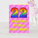 A frente deste design de cartão de saudação temático de 22 anos, divertido e otimista, apresenta um grande número de "22", tendo um padrão de gradação inspirado no espectro colorido do arco-íris. Também apresenta a mensagem "Feliz 22º Aniversário", seguida de um nome de destinatário personalizável. O plano de fundo da frente apresenta um padrão rosa-escuro e de faixas de rosa claro contendo formas cardíacas cor-de-rosa amorosas. O dentro apresenta uma mensagem de saudação de aniversário personalizada, ou talvez possa ser apagado e deixado o vazio se uma mensagem for escrita manualmente. Um cartão de aniversário personalizável como este pode ser uma maneira divertida de enviar desejos de aniversário a alguém que comemora seu vigésimo segundo aniversário. [~Z0000416]