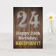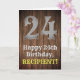 Este American Wild West inspirou e inspirou o design de cartões de saudação com tema de aniversário, inspirado no país, apresenta um grande número de aparência "24", a mensagem "Feliz 24 de aniversário", um nome personalizado, e um fundo de padrão de aparência falsa/imitação de grãos de madeira. O dentro tem uma mensagem de saudação de aniversário personalizada, ou talvez pudesse ser apagado e deixado vazio se uma mensagem fosse escrita manualmente. Um cartão de saudação de aniversário personalizado como este pode ser enviado para comemorar o vigésimo quarto aniversário de alguém. [~Z0000469]