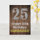 Este "country look and western inspirou a design de cumprimentos de aniversário apresenta um grande número "25" inspirado na rússia, a mensagem "Happy 25 Birthday", um nome personalizável, e um fundo de padrão de estilo "faux/imitation wood grain" inspirado no estilo. O dentro tem uma mensagem de saudação de aniversário editável, ou talvez possa ser apagado e deixado vazio se uma mensagem for escrita manualmente. Um cartão de saudação de aniversário personalizado como este pode ser uma maneira divertida de enviar uma mensagem de saudação de aniversário a alguém que está celebrando seu vigésimo quinto aniversário. [~Z0000469]
