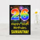 A frente deste design de cartão de saudação animador, colorido e divertido tema de aniversário apresenta um grande número de "26" tendo um padrão inspirado no gradiente do espectro do arco-íris. Também apresenta a mensagem "Feliz 26.º Aniversário", e um nome de destinatário editável. A frente também tem um padrão de fundo colorido inspirado pela aparência de fogos de artifício comemorativos em explosão. O dentro apresenta uma mensagem de saudação de aniversário personalizada, ou talvez possa ser apagado e deixado o vazio se uma mensagem for escrita manualmente. Um cartão de aniversário personalizado como este pode ser uma maneira divertida de enviar uma mensagem em comemoração do vigésimo sexto aniversário de alguém. [~Z0000442]