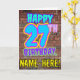 A frente deste design de cartão de saudação de aniversário divertido apresenta a mensagem "FELIZ 27º ANIVERSÁRIO", com uma aparência colorida, vibrante e inspirada no grafite, além de um nome de destinatário personalizado. O fundo da frente apresenta um padrão inspirado na parede do tijolo. O dentro tem uma mensagem de saudação de aniversário personalizada, ou talvez pudesse ser apagado e deixado vazio se uma mensagem for escrita manualmente. Um cartão de saudação de aniversário divertido e personalizável como este pode ser uma maneira divertida de enviar cartões de aniversários a alguém que está celebrando seu vigésimo sétimo aniversário. [~Z0000531]