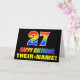A frente deste alegre, divertido e colorido design de cartão de saudação temático de aniversário apresenta um grande número "27" e a mensagem "FELIZ BIRTHDAY", ambos coloridos com um padrão inspirado no gradiente do espectro do arco-íris, juntamente com um nome de destinatário personalizado amarelo ousado. A frente também apresenta um plano de fundo preto claro. O dentro tem uma mensagem de saudação de aniversário editável, ou talvez possa ser apagado e deixado vazio se uma mensagem for escrita manualmente. Um vibrante cartão de aniversário personalizável como este pode ser uma maneira divertida de reconhecer o vigésimo sétimo aniversário de alguém. [~Z0000472]