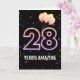 Balões de festa e confete sobre fundo negro com o neon número 28 para um aniversário de 28 anos.