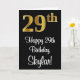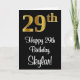 Este luxuoso, na moda, e elegante design de cartão de saudação de aniversário apresenta um grande número ordinal "29" com uma imitação/aparência falsa de ouro, mais a mensagem de saudação de aniversário "Feliz 29.º aniversário", e um nome editável em uma fonte estilo script na frente. O fundo da frente é preto colorido. O dentro tem uma mensagem de saudação de aniversário personalizável, ou talvez pudesse ser apagado e deixado o vazio se uma mensagem fosse escrita manualmente. Um cartão de cumprimentos de aniversário personalizado e luxuoso como este pode ser uma maneira divertida de enviar cartões de aniversários a alguém que comemora seu vigésimo nono aniversário. [~Z0000518]