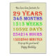 29º cartão de aniversário contando anos, dias, meses, horas e minutos. Uma carta para dar uma pausa para pensar! Foram tidos em conta os anos de salto!