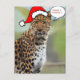 Cartão coloridos do Natal que você pode enviar em qualquer lugar. Um leopardo que veste um chapéu de Papai Noel está levantando com um fundo borrado. Da "os cumprimentos estação" são escritos no roteiro vermelho em uma bolha do discurso que vem da boca do leopardo.