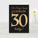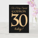 Um cartão de aniversário de 30 anos chique para "um Godson muito especial", com um número 30 compor dos números do ouro-efeito e da palavra "Godson", no ouro-efeito, em um fundo preto. A mensagem interna, que você pode mudar se você deseja, é "feliz aniversario"