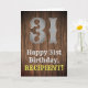 Este cartão de saudação de aniversário inspirado no ocidente e inspirado no país apresenta um grande número "31" rústico, a mensagem "Happy 31st Birthday", um nome editável, e um padrão de aparência inspirado em faux/imitation wood grain. O dentro tem uma mensagem de saudação de aniversário personalizada, ou talvez pudesse ser apagado e deixado vazio se uma mensagem for escrita manualmente. Um cartão de saudação de aniversário personalizável como este pode ser usado para reconhecer o aniversário de 31 anos de alguém. [~Z0000469]