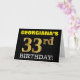 Este design de cartões de saudação de aniversário apresenta uma mensagem como "GEORGIANA'S 33rd BIRTHDAY!", com o "33º" a ter uma aparência falsa e imitada de cor dourada. O nome do destinatário na frente pode ser personalizado e o fundo frontal é preto colorido. Também apresenta uma mensagem de saudação de aniversário personalizável no dentro. Um cartão de aniversário como este talvez pudesse ser dado a alguém em comemoração do seu trigésimo terceiro aniversário. [~Z0000183]