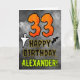 A frente deste design de cartões de saudação de aniversário temático e assustador do Hallowe'en apresenta um grande número "33" e a mensagem "FELIZ ANIVERSÁRIO", além de um nome personalizado. Há também representações de um morcego e de um fantasma na frente. O dentro apresenta uma mensagem de saudação de aniversário personalizada, ou talvez possa ser apagado e deixado o vazio se uma mensagem for escrita manualmente. Um cartão de aniversário como este pode ser uma maneira divertida de enviar desejos de aniversário a alguém que comemora seus trinta e três anos e que também foi nascer no Halloween (31 de outubro). [~Z0000547]