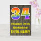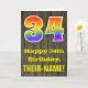 A frente desta design de saudação de aniversário colorida, mas rústica, apresenta um grande número "34" com um padrão inspirado no gradiente do espectro arco-íris. Também apresenta a mensagem "Feliz 34.º aniversário" e um nome de destinatário personalizável. A frente apresenta um fundo que representa um padrão de aparência rústico de grãos de madeira falsa. O dentro apresenta uma mensagem de saudação de aniversário personalizada, ou talvez possa ser apagado e deixado o vazio se uma mensagem for escrita manualmente. Um cartão de aniversário personalizado como este pode ser uma maneira divertida de celebrar o trinta e quatro anos de alguém. [~Z0000419]
