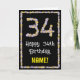 A frente desta divertida e inspirada na natureza, design de cartões de saudação com tema de aniversário tem a mensagem "Feliz 34 de aniversário", e um nome de destinatário personalizável. O grande número "34" mais a borda dos ícones de flor na parte frontal. O dentro apresenta uma mensagem de saudação de aniversário personalizada, ou talvez possa ser apagado e deixado vazio se uma mensagem for escrita manualmente. Um cartão floral, personalizável de saudação de aniversário como este pode ser usado para celebrar o trinta e quatro anos de alguém. [~Z0000648]