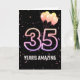 Balões de festa e confete sobre fundo negro com o neon número 35 para um 35º aniversário.