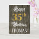 A frente deste rico e do design de cartão de saudação formal com tema de aniversário apresenta a mensagem "Feliz 35º aniversário", além de um nome de destinatário personalizado. Parte da mensagem está no texto luxuoso do estilo script. O grande número "35º" apresenta um padrão de aparência falsa/imitado inspirado em ouro. O fundo tem uma imitação/padrão falsa inspirado em madeira. O dentro tem uma mensagem de saudação de aniversário personalizada, ou talvez pudesse ser apagado e deixado vazio se uma mensagem fosse escrita manualmente. Um cartão de cumprimentos de aniversário editável como este pode ser uma maneira respeitável de enviar cartões de aniversários a alguém que comemora seus trinta e cinco anos. [~Z0000561]