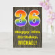 A frente desta colorida, mas rústica, design de cartões de saudação com tema de aniversário apresenta um grande número "36" com um padrão inspirado no gradiente do espectro arco-íris. Também apresenta a mensagem "Feliz 36.º aniversário", e um nome de destinatário personalizado. O plano de fundo da frente da placa apresenta um padrão de estilo rústico de fibra falsa de madeira. O dentro apresenta uma mensagem de saudação de aniversário personalizável, ou talvez possa ser apagado e deixado o vazio se uma mensagem for escrita manualmente. Um cartão de aniversário personalizado como este pode ser uma maneira divertida de enviar desejos de aniversário a alguém que comemora seus trinta e seis anos. [~Z0000419]