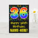 A frente deste design de cartões de saudação de aniversário divertidos, vibrantes e coloridos apresenta um grande número "36" com um padrão inspirado no gradiente do espectro arco-íris, juntamente com a mensagem "Feliz 36 de aniversário", e um nome de destinatário personalizado. A frente também tem notas de música coloridas e padrões de símbolos. O dentro apresenta uma mensagem de saudação de aniversário personalizável, ou talvez possa ser apagado e deixado o vazio se uma mensagem for escrita manualmente. Um cartão de aniversário personalizado como este pode ser uma maneira divertida de enviar desejos de aniversário a um músico, cantor, compositor ou outra pessoa que comemora seus trinta e seis anos. [~Z0000420]