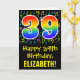 A frente deste design de saudação de aniversário divertida, vibrante e colorida apresenta um grande número "39" tendo um padrão inspirado no gradiente do espectro arco-íris. Também apresenta a mensagem "Feliz 39º aniversário", e um nome de destinatário editável. A frente também apresenta um padrão de várias notas e símbolos de música com várias cores e tamanhos. O dentro apresenta uma mensagem de saudação de aniversário editável, ou talvez pudesse ser apagado e deixado o vazio se uma mensagem fosse escrita manualmente. Um cartão de aniversário personalizável como este pode ser uma maneira divertida de enviar uma mensagem em comemoração do trigésimo nono aniversário de alguém. [~Z0000420]