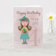 Menina do coral cantando "Parabéns para você" com olhos fechados e boca aberta. A garota tem flores em suas mãos e uma fita em seu cabelo louro. O fundo cor-de-rosa aflita e sutil 4 na frente simbolizando seu quarto aniversário.