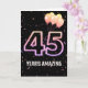 Balões de festa e confete sobre fundo negro com o neon número 45 para um aniversário de 45 anos.