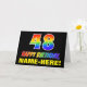 A frente deste design de cartão de saudação de aniversário colorida, divertida e alegre apresenta um grande número "48" e a mensagem "FELIZ ANIVERSÁRIO", ambos tendo um gradiente de padrão inspirado no espectro do arco-íris, juntamente com um nome de destinatário personalizado amarelo ousado. A frente também tem um fundo preto, claro e mínimo. O dentro apresenta uma mensagem de saudação de aniversário personalizada, ou talvez possa ser apagado e deixado vazio se uma mensagem for escrita manualmente. Um emocionante cartão de aniversário personalizável como este pode ser uma maneira divertida de enviar uma mensagem para celebrar o quarenta e oitavo aniversário de alguém. [~Z0000472]