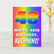 A frente deste alegre e empolgante design de saudação de aniversário apresenta um grande número "48" com um padrão de gradação inspirado no espectro arco-íris, juntamente com a mensagem "FELIZ 48º ANIVERSÁRIO", e um nome personalizado. O fundo da frente também tem um padrão multicolorido de gradiente do espectro do arco-íris. O dentro tem uma mensagem de saudação de aniversário personalizável, ou talvez pudesse ser apagado e deixado o vazio se uma mensagem fosse escrita manualmente. Um feliz e personalizável cartão de saudação de aniversário como este pode ser usado para reconhecer o quarenta e oitavo aniversário de alguém. [~Z0000570]