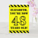 A frente deste design de cartão de saudação com tema de atenção e ousado aniversário apresenta um nome personalizado e a mensagem "VOCÊ AGORA TEM 48 ANOS!" em texto de aparência de estêncil preto em um fundo de cor amarela. A parte frontal também apresenta um padrão de listras amarelas e pretas que se chama olho nas bordas superior e inferior. O dentro apresenta uma mensagem de saudação de aniversário personalizada, ou talvez possa ser apagado e deixado o vazio se uma mensagem for escrita manualmente. Um cartão de aniversário personalizado como este pode ser uma maneira divertida de enviar desejos de aniversário a alguém que comemora seus quarenta oitavos anos. [~Z0000413]