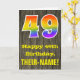 A frente deste design de cartão de saudação colorida, mas rústica, com tema de aniversário apresenta um grande número "49" com um padrão inspirado no gradiente do espectro arco-íris, juntamente com a mensagem "Feliz 49º aniversário", e um nome de destinatário editável. O fundo da frente da placa apresenta um padrão de aparência rústico do grão de madeira falsa. O dentro apresenta uma mensagem de saudação de aniversário personalizada, ou talvez possa ser apagado e deixado o vazio se uma mensagem for escrita manualmente. Um cartão de aniversário personalizável como este pode ser uma maneira divertida de reconhecer o quarenta e nono aniversário de alguém. [~Z0000419]
