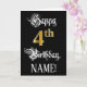 A frente deste design de cartão de saudação opulente e elaborado com tema de aniversário apresenta a mensagem "Feliz 4.º aniversário" e um nome de destinatário personalizado. Parte da mensagem está em um texto formal estilo script, o grande número "4º" apresenta um padrão de aparência falsa/imitado de inspiração dourada, e o fundo é preto colorido. O dentro tem uma mensagem de saudação de aniversário personalizável, ou talvez pudesse ser apagado e deixado o vazio se uma mensagem fosse escrita manualmente. Um cartão de cumprimentos de aniversário personalizável como este pode ser enviado para comemorar o quarto aniversário de alguém. [~Z0000559]