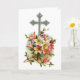 Uma cruz prateada com uma borda branca no meio de uma tulipa branca e cor-de-rosa e folhas verdes com fundo azul de névoa e isolada em branco. As palavras Confiam no Senhor. E ele te abençoará. Culto com todo o seu coração. Ele vai vigiá-lo. Ouça o que ele diz a você. Ele fala calmamente no seu ouvido. Obedeça a cada palavra dele. Ele vai te ensinar muito que está na segunda página do cartão.