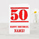 Este design de cartão de saudação de aniversário divertido apresenta um grande número vermelho "50" com uma aparência inspirada no carimbo, além da mensagem de saudação de aniversário "FELIZ ANIVERSÁRIO" e um nome editável na frente. O dentro tem uma mensagem de saudação de aniversário editável, ou talvez possa ser apagado e deixado vazio se uma mensagem for escrita manualmente. Um divertido cartão de saudação de aniversário, personalizável, como este, pode ser uma maneira divertida de entregar alguns desejos de aniversário a alguém que está comemorando seu quinquagésimo aniversário. [~Z0000524]