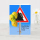 CUIDADO: Largue-Me. Sobre o cartão de aniversário de 50 anos. A placa de papel apresenta uma placa de estrada com queda acentuada no polo de alumínio com balões de precaução amarelos acoplados. Arte, imagem e copyright © Shoaff Ballanger Studios.