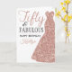 Mande uma saudação de aniversário personalizada com este elegante vestido de glitter dourado de rosa, cinquenta e fabuloso cartão de aniversário de 50 anos. O nome na frente pode ser facilmente personalizado para essa pessoa especial e a mensagem na dentro do cartão também pode ser personalizada.
