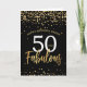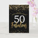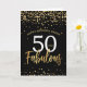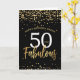 Cartão de aniversário moderno de 50 anos fabuloso. Este design sofisticado apresenta tipografia em dourado e branco sobre um fundo preto e confetes dourados. Personalize com um nome na frente e sua mensagem dentro.
