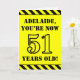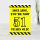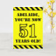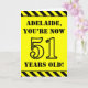 A frente deste design de cartão de saudação ousado e divertido, com tema de aniversário, apresenta um nome personalizado e a mensagem "VOCÊ AGORA TEM 51 ANOS!" em texto no estilo de estêncil preto em um fundo de cor amarela. Há também um padrão de listras preto e amarelo que chama a atenção nas bordas superior e inferior da frente. O dentro apresenta uma mensagem de saudação de aniversário personalizável, ou talvez possa ser apagado e deixado o vazio se uma mensagem for escrita manualmente. Um cartão de aniversário personalizado como este pode ser uma maneira divertida de enviar desejos de aniversário a alguém que comemora seus cinquenta anos. [~Z0000413]