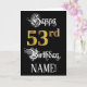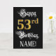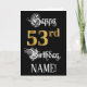 A frente deste elaborado e luxuoso design de cartão de saudação de aniversário apresenta a mensagem "Feliz 53º Aniversário", além de um nome de destinatário personalizado. Parte da mensagem está em um texto opulente no estilo de script, o grande número "53º" apresenta um padrão de aparência falsa/imitado inspirado em ouro, e o fundo é preto colorido. O dentro tem uma mensagem de saudação de aniversário personalizada, ou talvez possa ser apagado e deixado vazio se uma mensagem for escrita manualmente. Um cartão de cumprimentos de aniversário personalizável como este pode ser usado para reconhecer o cinquenta e terceiro aniversário de alguém. [~Z0000559]