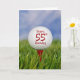 Feche uma bola de golfe branca numa colmeia vermelha na grama com fundo do céu durante 55 anos.