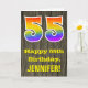 A frente desta design de cartão de saudação colorida, mas rústica, do aniversário apresenta um grande número "55" com um padrão inspirado no gradiente do espectro arco-íris, juntamente com a mensagem "Feliz 55.º Aniversário", e um nome de destinatário editável. O fundo da frente da placa apresenta um padrão de aparência rústico de grãos de madeira falsa. O dentro apresenta uma mensagem de saudação de aniversário personalizável, ou talvez possa ser apagado e deixado o vazio se uma mensagem for escrita manualmente. Um cartão de aniversário como este pode ser uma maneira divertida de enviar desejos de aniversário a alguém que comemora seus cinquenta anos. [~Z0000419]