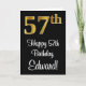 Este elegante, sofisticado e luxuoso design de cartões de saudação de aniversário apresenta um grande número ordinal "57º", com um olhar imitado/falsa inspirado em ouro, juntamente com a mensagem de saudação de aniversário "Feliz 57º Aniversário", e um nome personalizável em uma fonte estilo script na frente. O fundo da frente é preto colorido. O dentro tem uma mensagem de saudação de aniversário personalizada, ou talvez pudesse ser apagado e deixado vazio se uma mensagem fosse escrita manualmente. Um elegante e editável cartão de cumprimentos de aniversário como este pode ser uma maneira divertida de entregar uma mensagem de saudação de aniversário a alguém que está celebrando seu cinquenta e sétimo aniversário. [~Z0000518]