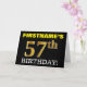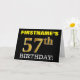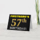 Este design de cartão de saudação de aniversário apresenta uma mensagem como "PRIMEIRO NOME DO 57º ANIVERSÁRIO!", com o "57º" a ter uma aparência falsa/imitada de cor dourada. O nome do destinatário na frente pode ser personalizado e o fundo frontal é preto colorido. Também apresenta uma mensagem de saudação de aniversário personalizada no dentro. Um cartão de aniversário como este talvez pudesse ser dado a alguém em comemoração do seu cinquenta e sétimo aniversário. [~Z0000183]