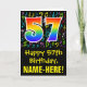 A frente deste design de cartões de saudação divertidos, coloridos e vibrantes, com tema de aniversário, apresenta um grande número "57" com um padrão inspirado no gradiente do espectro arco-íris, juntamente com a mensagem "Feliz 57º aniversário", e um nome de destinatário personalizado. A frente também tem notas de música coloridas e padrões de símbolos. O dentro apresenta uma mensagem de saudação de aniversário personalizada, ou talvez possa ser apagado e deixado o vazio se uma mensagem for escrita manualmente. Um cartão de aniversário personalizável como este pode ser uma maneira divertida de enviar uma mensagem em comemoração dos cinquenta e sete anos de alguém. [~Z0000420]