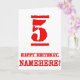 Este design de cartão de saudação de aniversário divertido apresenta um grande número vermelho "5", com uma aparência inspirada por carimbo, juntamente com a mensagem de saudação de aniversário "FELIZ ANIVERSÁRIO", e um nome personalizado na frente. O dentro tem uma mensagem de saudação de aniversário personalizada, ou talvez pudesse ser apagado e deixado vazio se uma mensagem fosse escrita manualmente. Um cartão de saudação de aniversário divertido e editável como este pode ser enviado para celebrar o quinto aniversário de alguém. [~Z0000524]