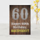 Este Velho Oeste Americano inspirou o olhar Selvagem Americano e o país inspirou-se no aniversário, o templo design de carta saudável apresenta um grande número "60", a mensagem "Feliz 60.º Aniversário", um nome editável e um padrão de estilo "faaux/imitação de grãos de madeira". O dentro tem uma mensagem de saudação de aniversário personalizada, ou talvez possa ser apagado e deixado vazio se uma mensagem for escrita manualmente. Um cartão de saudação de aniversário personalizado como este pode ser enviado para comemorar o sexagésimo aniversário de alguém. [~Z0000469]