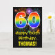 A frente deste design de cartão de aniversário emocionante, divertido e colorido apresenta um grande número "60" com um padrão de gradiente de espectro de arco-íris. Também apresenta a mensagem "Feliz 60º Aniversário," e um nome de destinatário personalizado. A frente também tem um padrão de fundo colorido inspirado na aparência de fogos de artifício comemorativos estourando. O interior apresenta uma mensagem de aniversário personalizável ou pode ser limpo e deixado em branco se uma mensagem for escrita à mão. Um cartão de aniversário personalizável como este pode ser uma maneira divertida de celebrar o sexagésimo aniversário de alguém.
