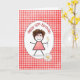 Garota bonitinha com cabelo, óculos vermelhos, vestido de gingham, e segurando margaridas em um padrão de gingham vermelho e branco para o 60º aniversário. O número de idade pode ser alterado.