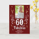 60 e Fabuloso Cartão com fotos de aniversário de 60 anos. 60 e texto fabuloso em um roteiro branco com nome e folhagem branca em um fundo vermelho escuro. Personalize com sua foto, seu nome e a idade. Adicione o dentro de texto à placa ou apague-a.