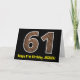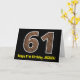 A frente desta design de cartões de saudação, rusticamente divertida, com tema de aniversário, apresenta um grande número de "61" tendo um padrão de estilo falso inspirado em grãos de madeira, juntamente com a mensagem "Feliz aniversário de 61ruas", e um nome personalizado. O dentro apresenta uma mensagem de saudação de aniversário personalizada, ou talvez possa ser apagado e deixado o vazio se uma mensagem for escrita manualmente. Um cartão de aniversário personalizado como este pode ser uma maneira divertida de enviar uma mensagem em comemoração do sessenta primeiro aniversário de alguém. [~Z0000431]